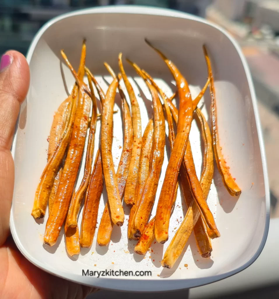 These are called vathals in tamil – The sun dried vegetables are called Vathal. It’s one of the traditional and oldest way to preserver the vegetables. We can make vathal using ladysfinger, bitter gourd, ivy gourd , cluster beans, green chilies, manathakkali ,tomato  etc.  Once the vegetables are completely sun-dried these will be stored in the air tight container and deep fried when required.
